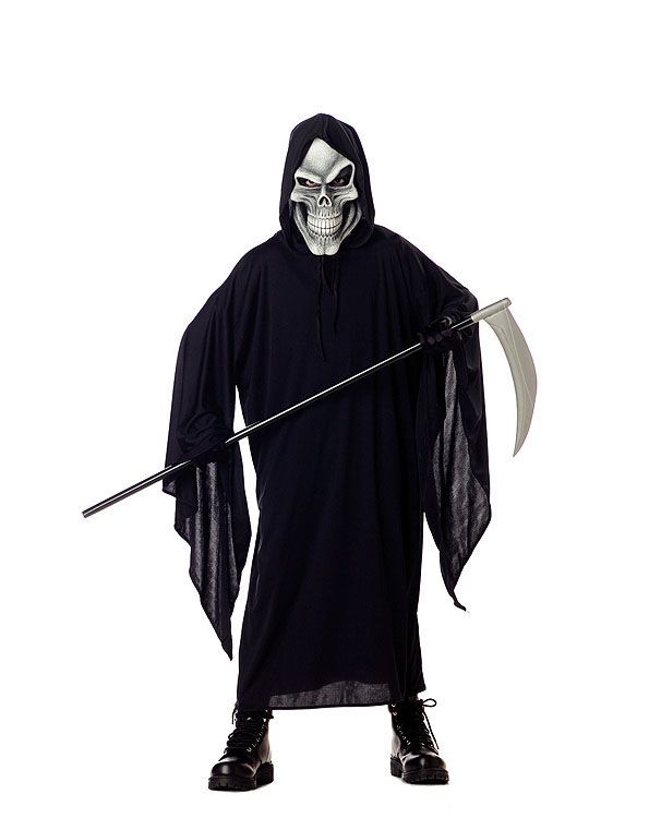 Детский костюм Ухмыляющейся Смерти выполнен в черном цвете и включает в себя длинную мантию с большими рукавами и капюшоном, а также маску в серых тонах с ухмылкой на лице. Коса в комплект не входит, но ее можно приобрести у нас отдельно (арт. АК-134). Надев такой костюм любой мальчишка станет бесстрашным на вечеринке.