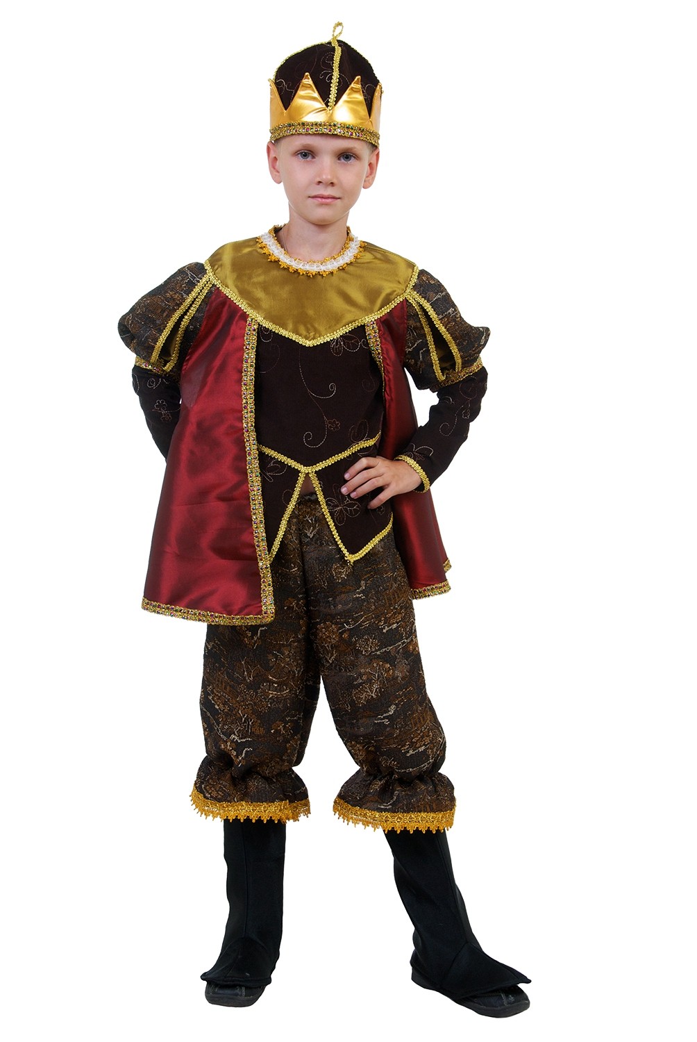 Костюм короля для детей включает в себя коричневые шаровары с черными накладками на обувь, шикарный коричневый камзол с золотистой отделкой и накидкой, а также королевскую шапку с золотистой отделкой.Цветовая гамма костюма может отличаться от предоставленной на сайте.