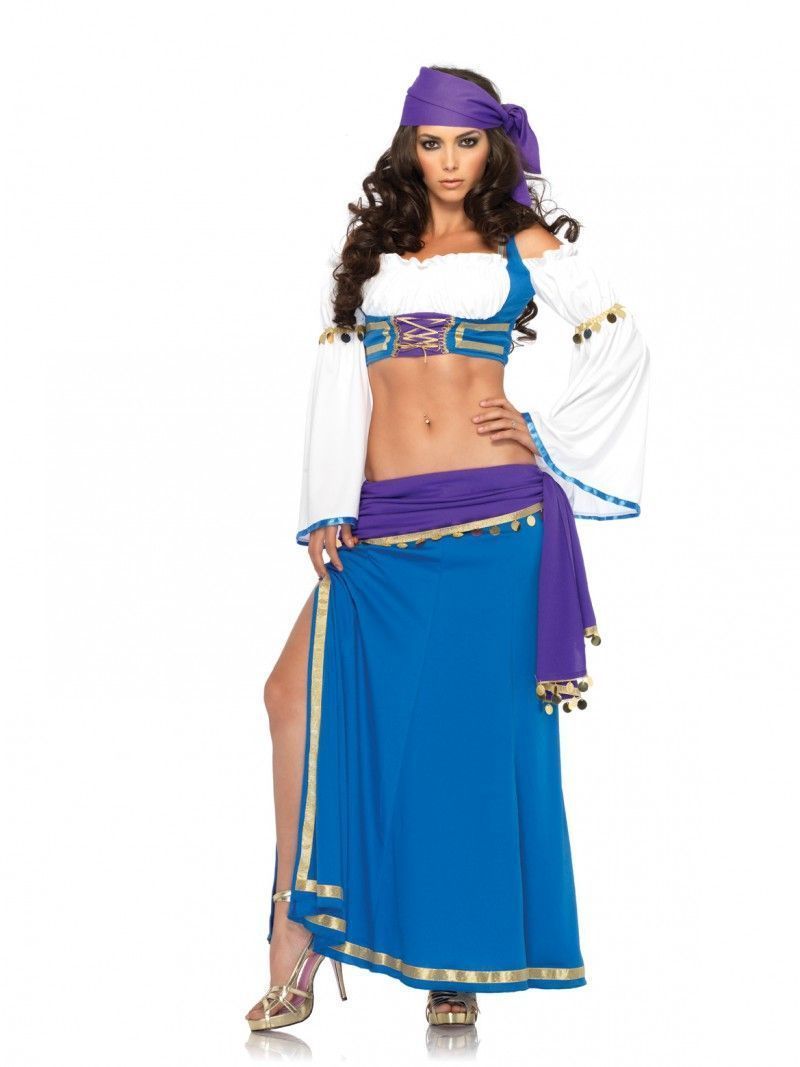 Костюм соблазнительной цыганки прекрасно подойдет для карнавалов, маскарадов и тематических вечеринок. В комлпект костюма входит длинная голубая юбка с разрезом сбоку и золотой отделкой, короткий белый топ с длинными рукавами, а также платок на голову фиолетового цвета.