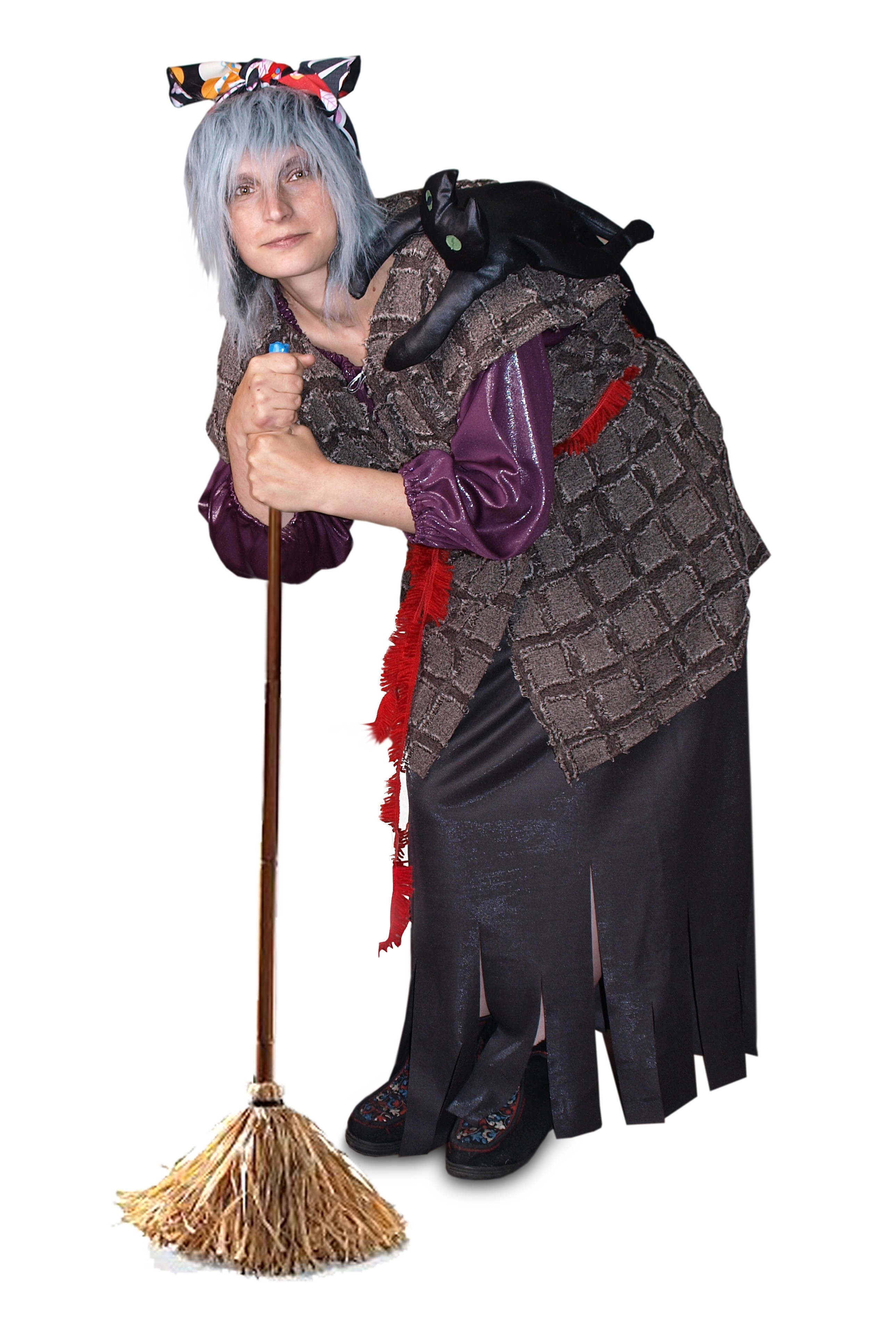 Карнавальный костюм Бабы Яги отлично подойдет для постановки спектаклей и различных сценок. В комплект костюма входи длинная черная юбка с разрезами, блестящая фиолетовая блузка, клетчатый коричневый жилет, а также цветастая косынка.