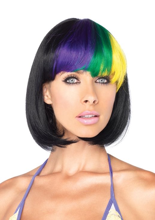 Парик с цветной челкой - блестящий парик с прической каре черного цвета и цветной аккуратной челкой. Парик поможет дополнить множество клубных нарядов и изменить ваш образ до неузнаваемости.