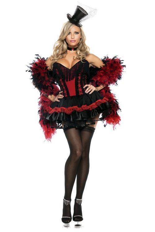 Костюм шикарной девушки из кабаре выполнен в красно-черных цветах. Костюм включает в себя открытое бюстье с декоративными шнуровками и бахромой, к которому прикреплена черная пышная юбочка с красной отделкой, а также имеется украшение не шею. Шарф, шляпа и чулки в комплект не входят. Идеально для костюмированных вечеринок и романтических вечеров.