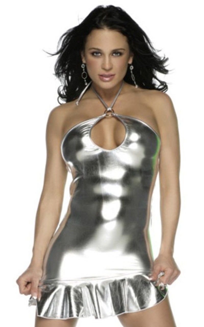 Яркое серебристое виниловое клубное платье для вечеринок. В комплект входят стринги.