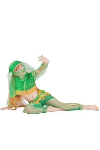 В комплект костюма Принцесса Жасмин зеленого цвета входят качественно сшитый зеленый топ, шаровары и шапочка с вуалью.