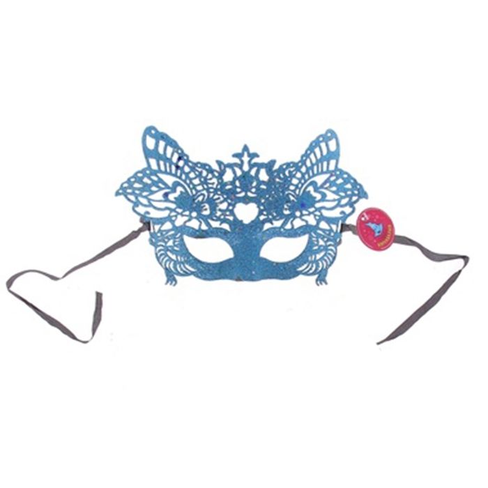 Ажурная голубая маска - это красивая карнавальная маска оригинальной формы на пол лица. Маска обильно покрыта блестками и украшена маленькими звездочками. Размер маски 15 × 25 см.