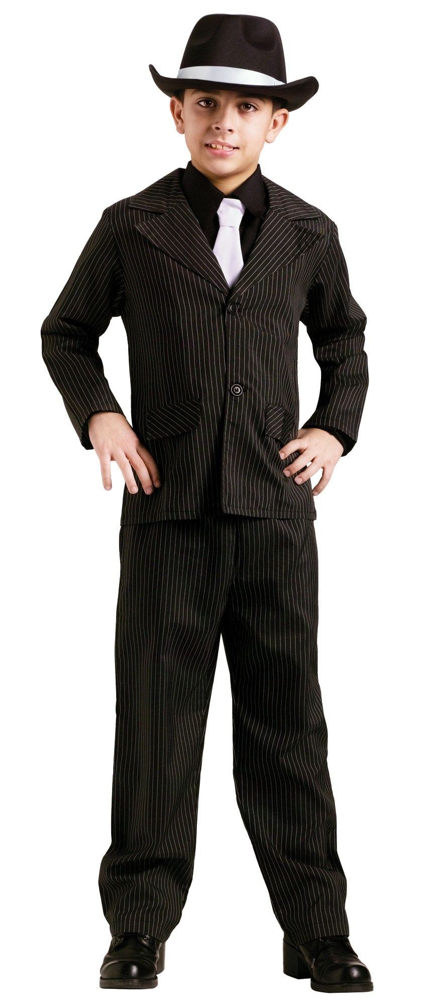 Детский костюм грозного гангстера состоит из черных брюк с белой тонкой полоской, пиджак на пуговицах, манишка в виде рубашки черного цвета, а также белый галстук, который придает брутальности в образ.