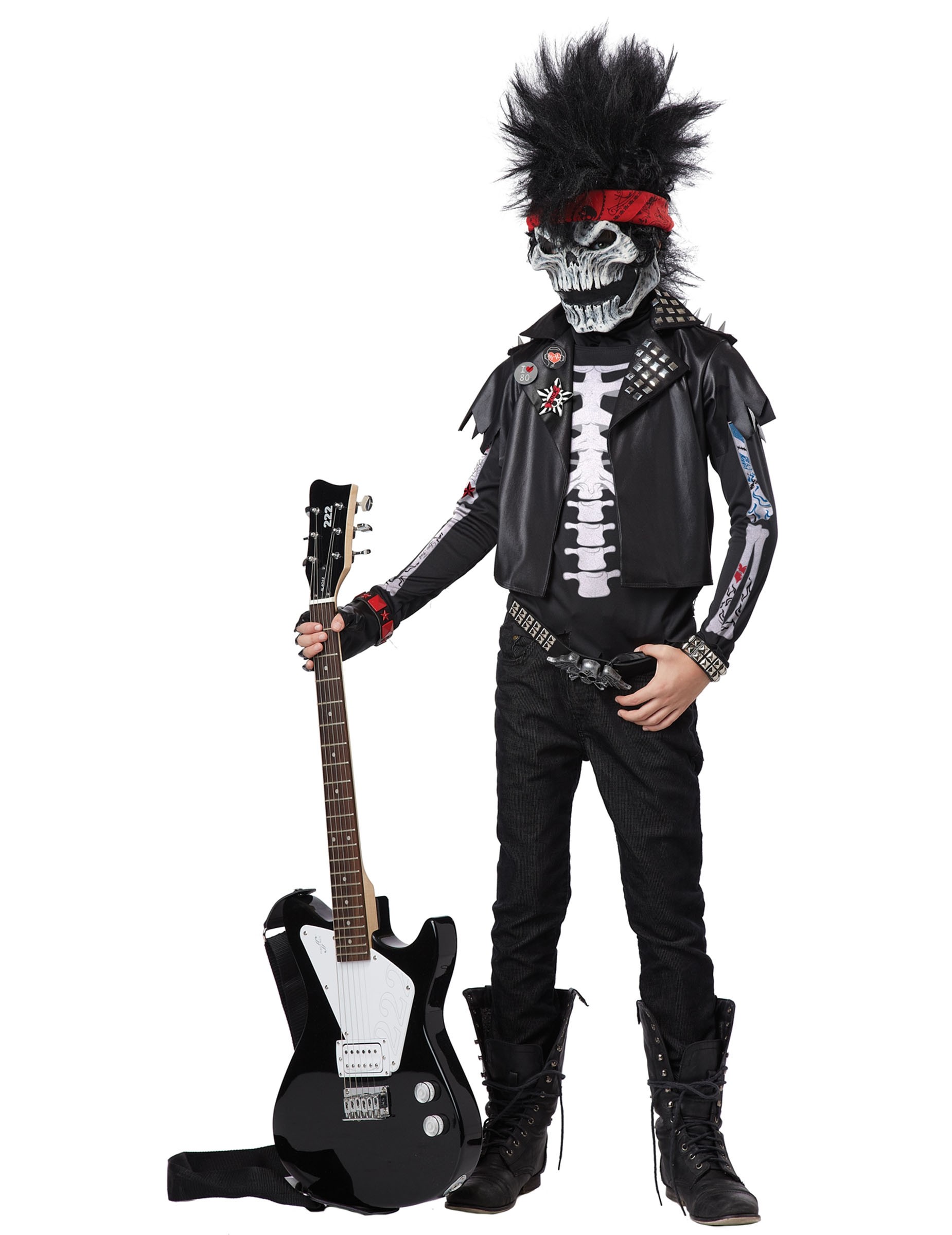 Детский костюм рокера скелета - ужасающий наряд, который сможет поразить каждого на тематической вечеринке. В комплект костюма входит рубашка черного цвета с принтом костей скелета, черный жилет из искусственного кожаного материала, значки, который крепятся к жилету, браслет с клепками, ремень с бляхой в виде черепа с крыльями, а завершает образ маска, которая представляет собой через с черными ирокезом.