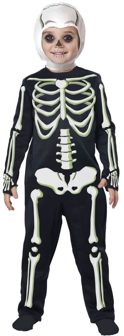 Детский светящийся костюм скелетика включает в себя свободный черный комбинезон с принтом костей скелета, а также головной убор, имитирующий череп. Принт светится в темноте.Дополнить образ можно гримом.