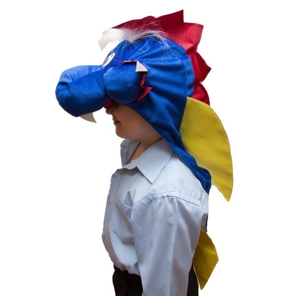 Детская шапка Дракон отлично подойдет для детских маскарадов и карнавалов. Шапка выполнена в виде головы Дракона с пришитыми крыльями. Шапка синего цвета с красными зубчиками и желтыми крыльями.