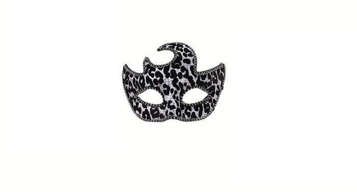 Серая маска грациозной пятнистой кошки. Маска изготовлена из пластика и имеет размер 14х18 см.