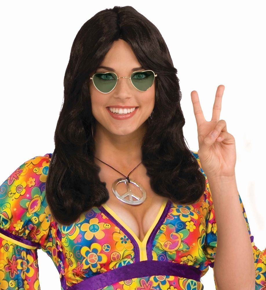 Черный парик хиппи выполнен из искусственных волокон. Парик представляет собой не слишком длинные черные волосы, разделенные на две стороны. Волосы слегка вьющиеся.