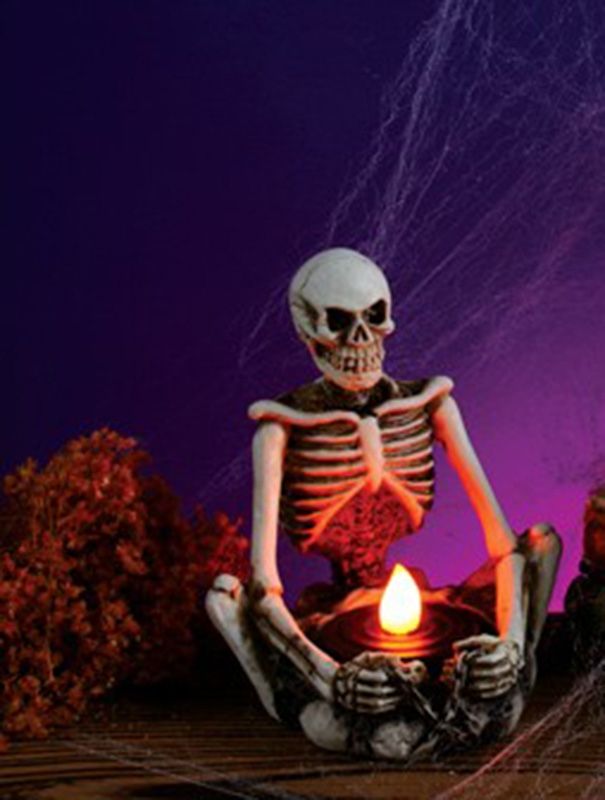 Светильник-подсвечник Скелет представляет собой сидящего скелета, который закован в кандалы. Скелет держит перед собой декоративную свечку, пламя которой - это обычная лампочка.