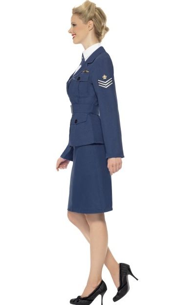 Костюм помощницы пилота выполнен в темно-синем цвете. В комплект костюма входит приталенный пиджак с поясом, юбка-карандаш, рубашка с галстуком.