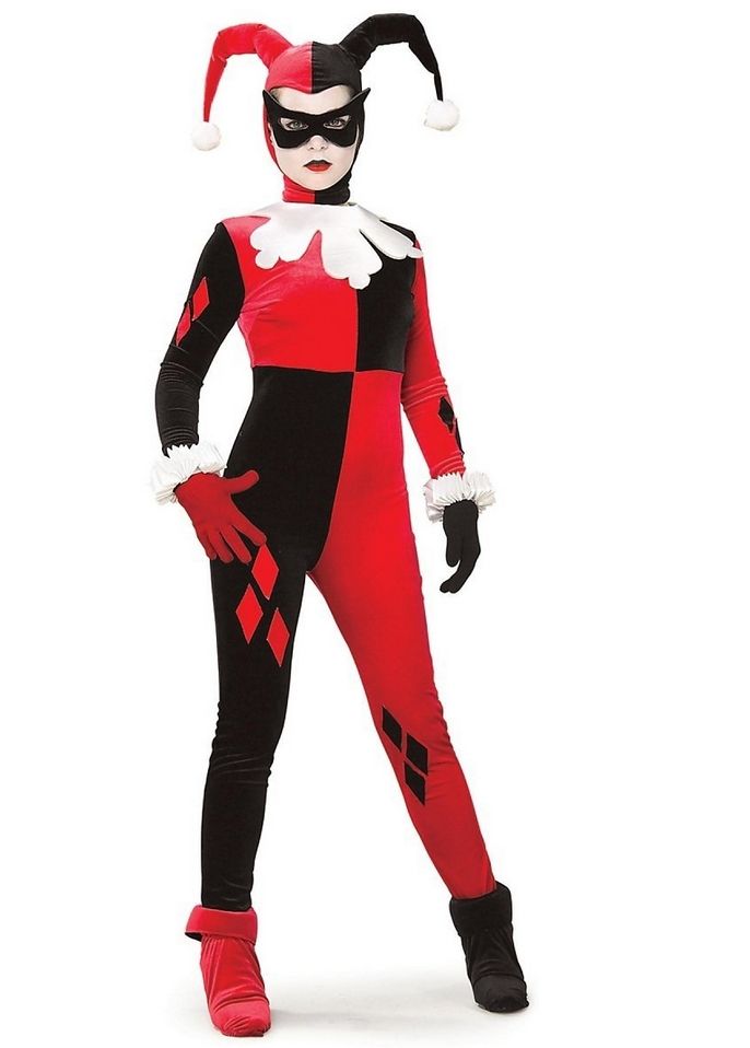 Костюм Харли Квинн - это одна из героинь комиксов про Бэтмена, которая влюблена в Джокера. Костюм выполнен в красно-черном цвете и включает в себя двухцветный комбинезон с прикрепленными накладками на обувь, белый воротник, головной убор с помпонами, а также черную маску на глаза.