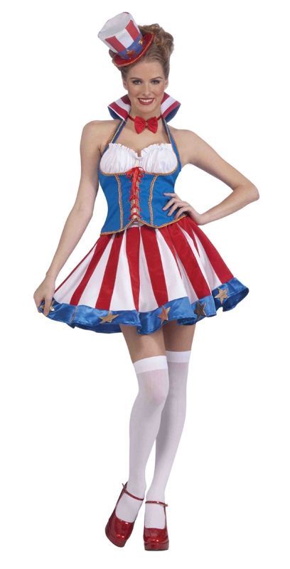 Костюм секси патриотки прекрасно подойдёт для патриотических праздников. В костюме есть маленькая шляпка с полосами и звёздами, топ с корсетом, красный галстук-бабочка и юбка с полосками и звёздочками. К костюму вы можете подобрать подходящие чулочки, обувь и прочие вещи.