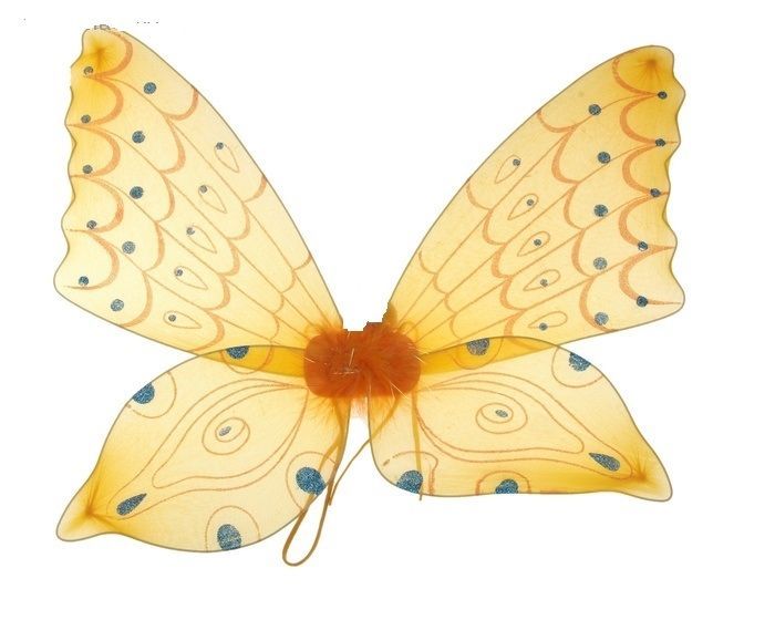 Крылья бабочки оранжевые со стразами синего цвета придадут образу легкость и дополнят костюмы феи и других сказочных персонажей. Размер крыльев 55х50 см.