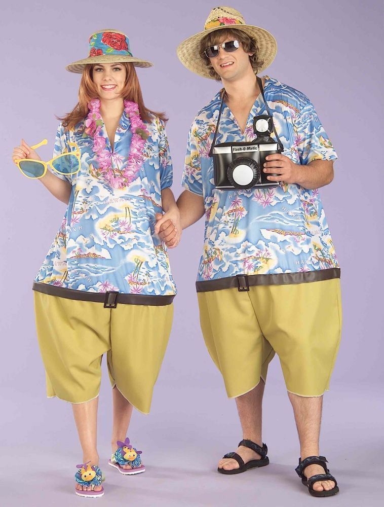 Костюм тропический турист - это комбинезон, который имитирует надетые бриджи цвета хаки и цветастую рубашку голубого цвета. На талии имеется обруч, который создает имитацию огромного живота.