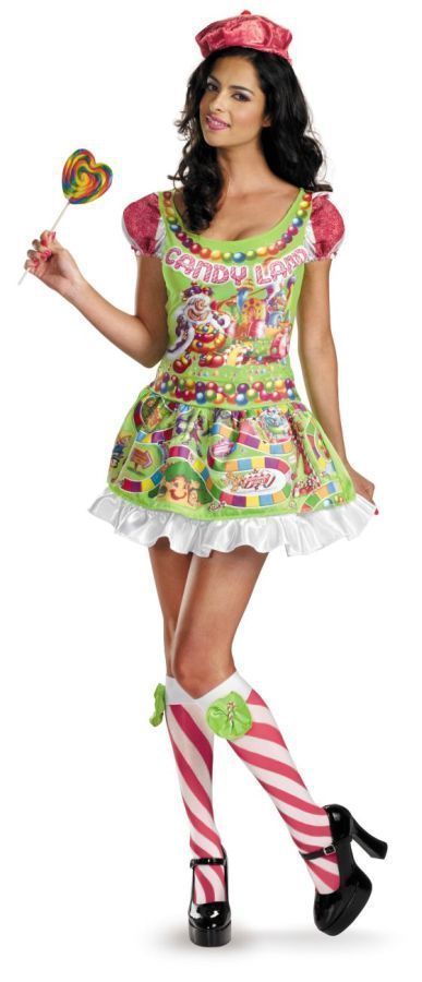 Костюм конфетной девочки включает в себя яркое короткое платье, подъюбник, шапочку и полосатые гольфы. Такой яркий и позитивный костюм подойдёт для карнавалов, маскарадов и выступлений.