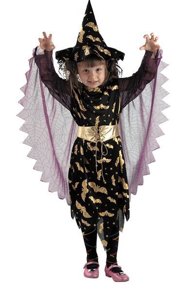 В комплект костюма летучей мыши детский входят платье с накидкой, золотистый пояс, колпак . Рукава в костюме выполнены из прозрачной ткани. Крылышки сделаны из легкого и приятного на ощупь материала.