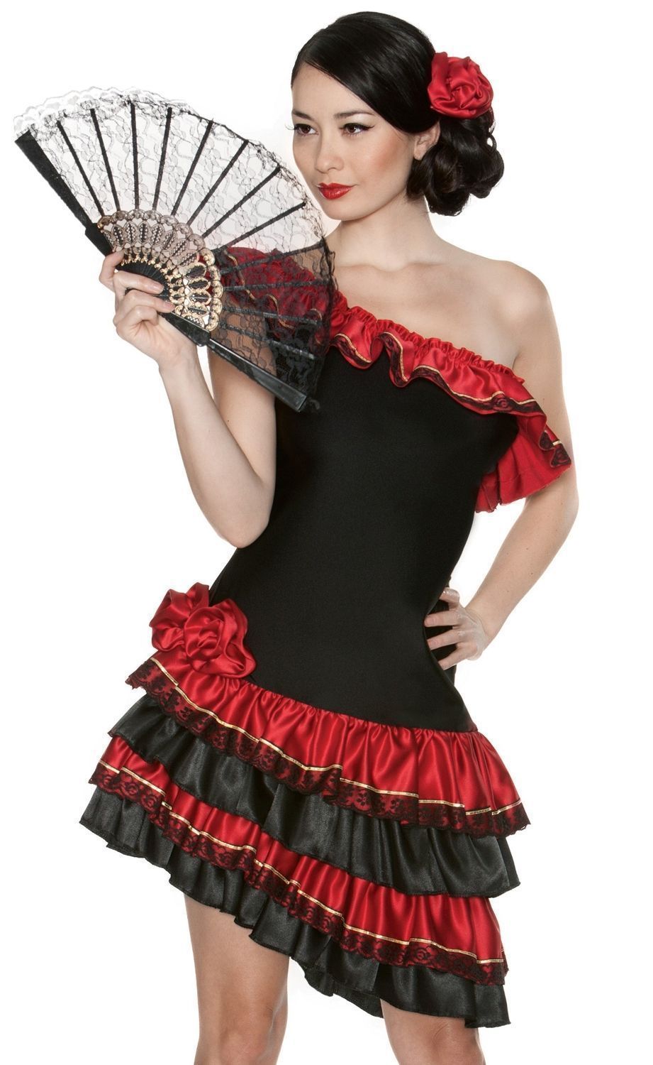 Костюм страстной испанской танцовщицы - это национальный костюм, который подойдет для выступлений, а также тематических костюмированных вечеринок. Костюм включает в себя короткое платье в испанском стиле. Платье выполнено в черном цвете с красными оборками. К платью прилагается заколка в виде красной розы, а также кружевной черный веер. Этот костюм выглядит строго и привлекательно!