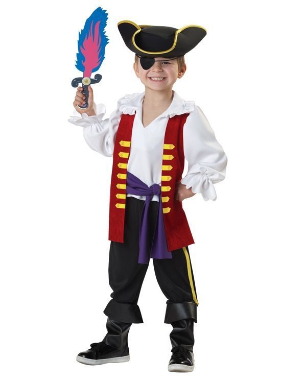 Детский костюм капитана Крюка включает в себя белую рубашку с прикрепленным красным жилетом, пояс фиолетовго цвета, брюки с прикрепленными голенищами, черную пиратскую шляпу и завершающим штрихом является меч в виде яркого пера из пенопласта. Различные дополняющие аксессуары вы можете приобрести у нас отдельно.
