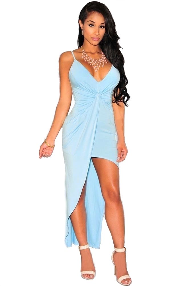 Легкое голубое платье прекрасно подойдет для коктейльных вечеринок. Платье на тонких лямочках с глубоким вырезом и асимметричным подолом. Сзади часть спины обнажена.