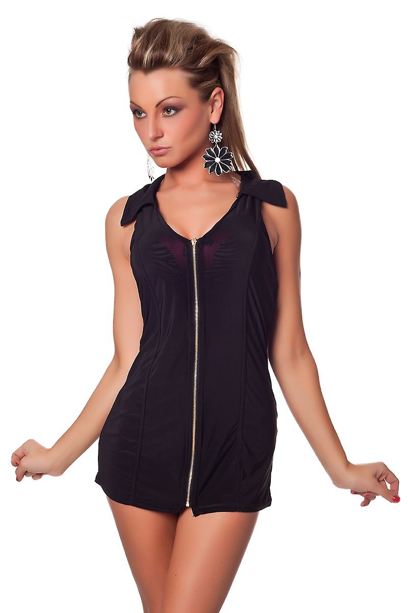 Коротенькое платье выполнено в черном цвете из еле просвечивающегося материала. Спереди имеется молния по всей длине. К лямке прикреплен небольшой воротничок. Сзади есть свободная ромбовидная шнуровка черного цвета. В этом очень коротком платье вы сможете с легкостью соблазнить своего любимого человека.