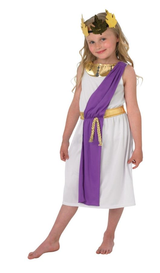 Костюм Римской девочки включает в себя белое платье с фиолетовой накидкой и золотистой отделкой. Также в комплект входит золотистый венок.