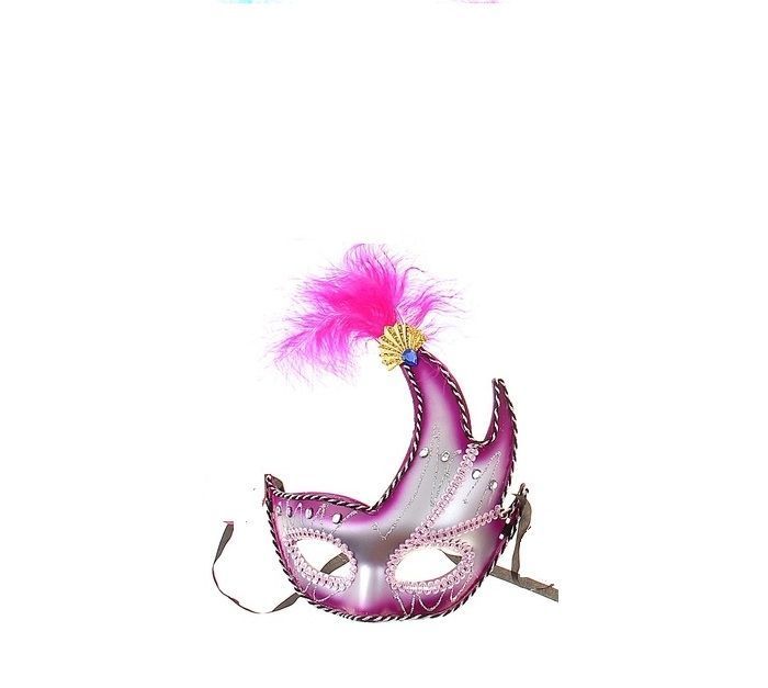 Серебристо-фиолетовая маска с черно-белой окантовкой, розовыми перьями и разноцветными камушками. Маска сделана из пластика и имеет размер 17х20 см.