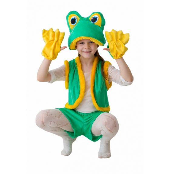 Детский костюм Лягушки Квакушки выполнен из мехового материала яркого зеленого цвета. В комплекте короткие шортики, безрукавка с желтой меховой отделкой, перчатки желто-зеленого цвета, а также шапку-маску с глазами лягушки.