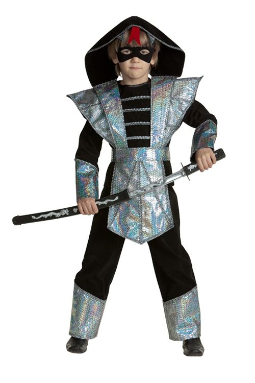 Карнавальный костюм змея-ниндзя для настоящего героя. В комплект детского костюма входит куртка с чёрными рукавами и перламутровыми манжетами. Брючки выполнены в той же цветовой гамме – чёрные с перламутровыми вставками. Воинственности образу придаёт самурайский меч, а загадочности – чёрная маска на глаза. Завершает образ смелого ниндзя кимоно блестящего перламутрового цвета с капюшоном.
