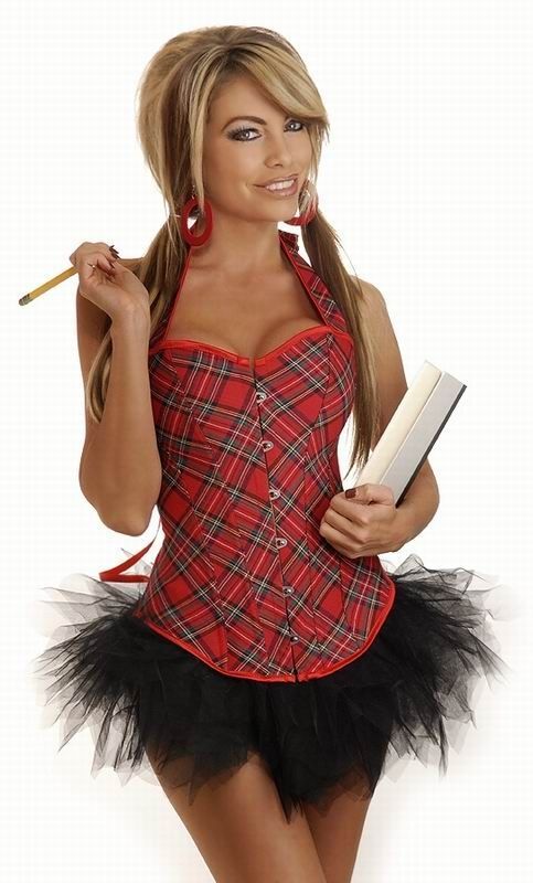 Красный корсет в клетку с черной юбкой застегивается спереди на крючки, сзади имеется шнуровка. Корсет с юбкой - школьница подойдет для тематических вечеринок. В комплекте идут стринги.