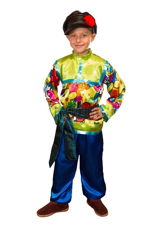 Яркий костюм Ванюши - русский народный костюм, который включает в себя темно-синие атласные брюки, яркую рубаху с цветочным узором, пояс, а также черную кепку с красным цветком.