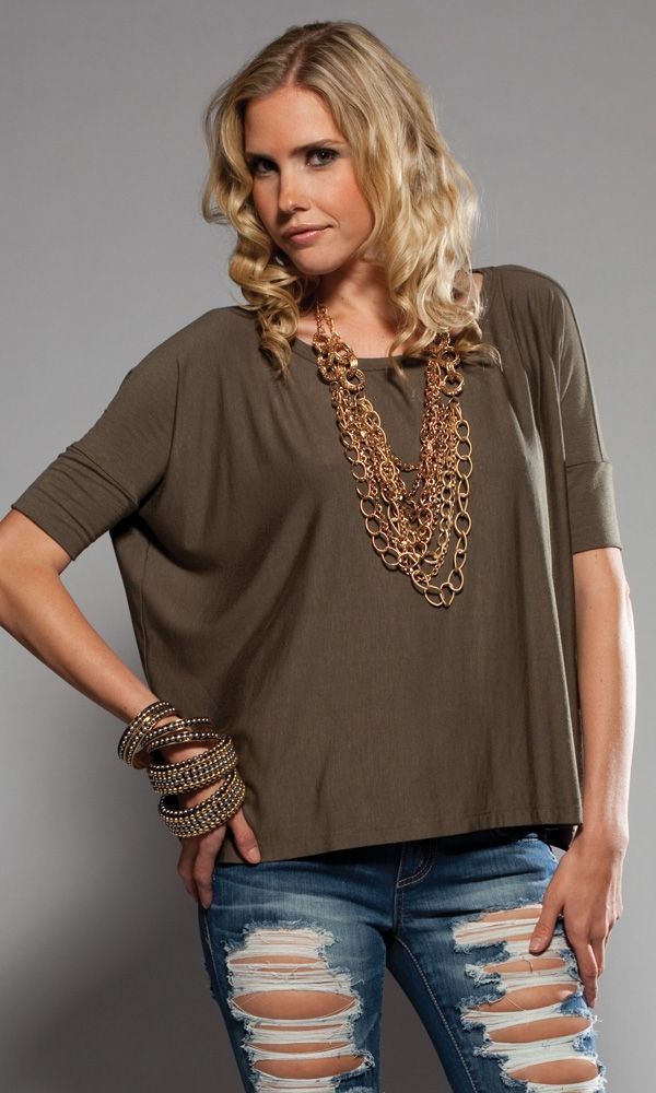 Оливковый широкий топ с коротким обтягивающим рукавом. На спине имеются вертикальные вырезы. Такой топ можно одевать под джинсы.