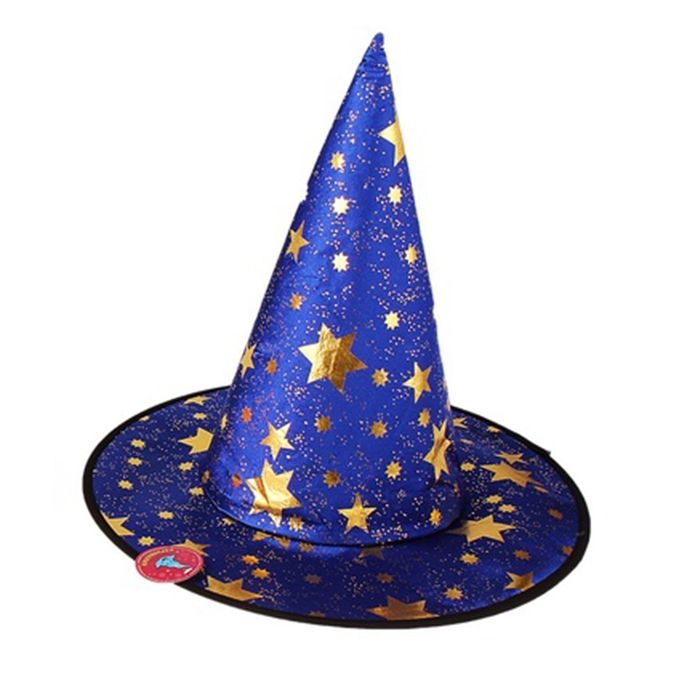 Синяя шляпа со звездами - это высокая конусовидная шляпа, выполненная в синем цвете и украшенная золотистыми звездами разного размера. Шляпа отлично дополнит различные костюмы ведьм и волшебников и станет прекрасным аксессуаром для Хэллоуина и других костюмированных вечеринок. Размер 37 × 37 × 35 см.