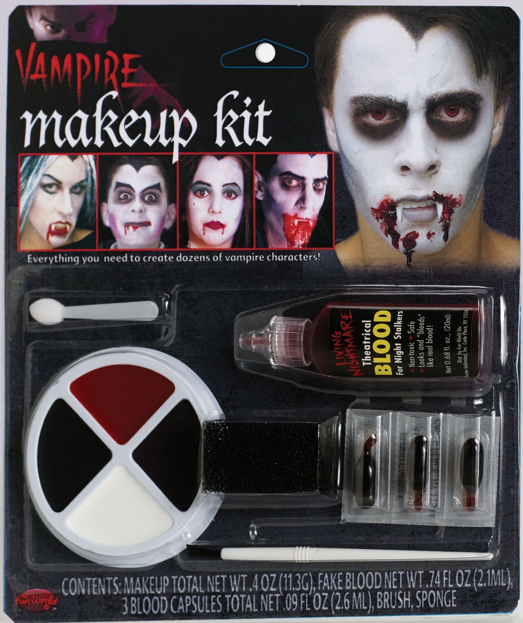 Вампирский грим - это набор, который включает в себя палитру с краской черного, белого и красного цветов, тюбик с искусственной кровью ( 20 мл), три капсулы с кровью, одна длинная кисточка, мазок и черная губка.