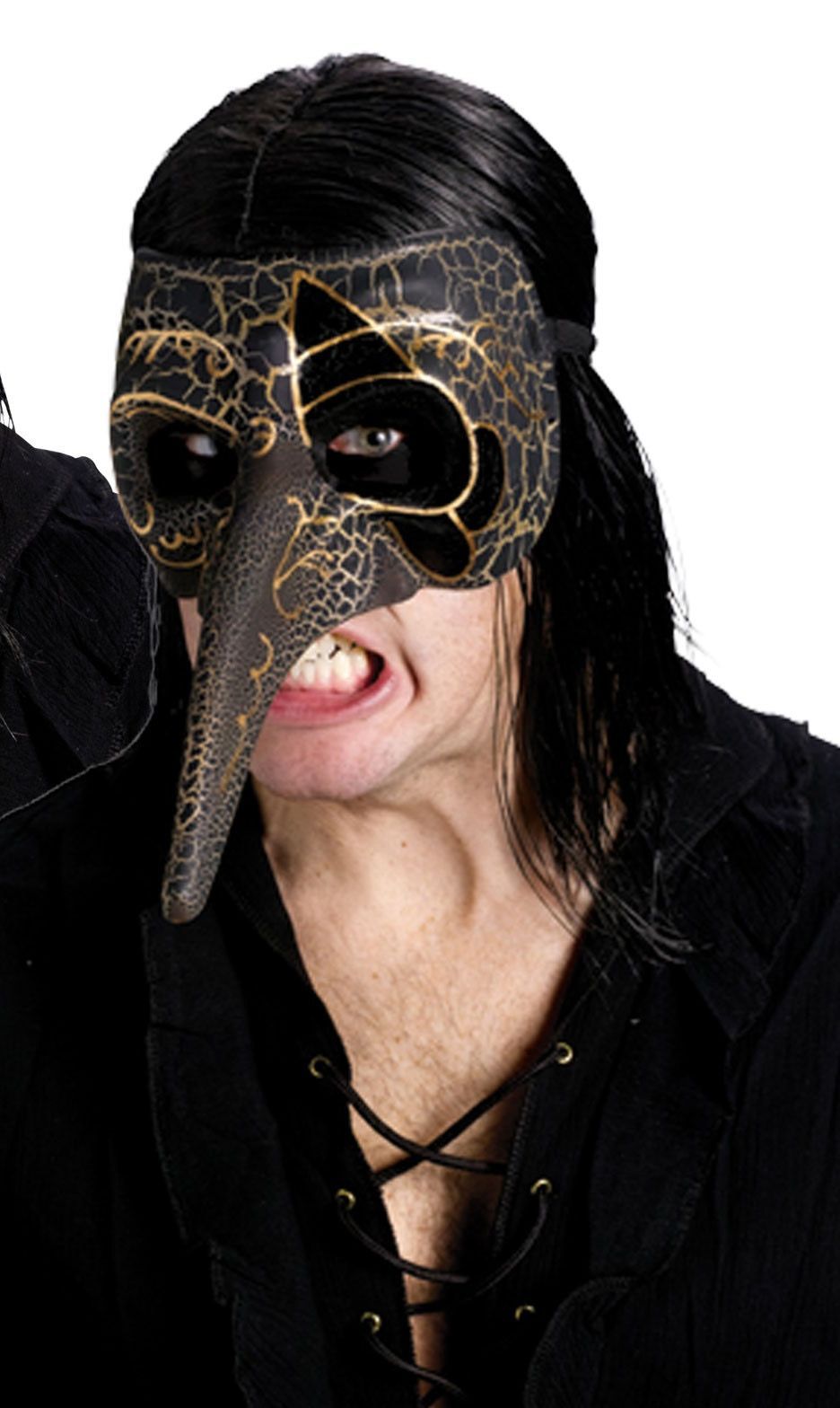 Венецианская коричневая маска ворона идеально подойдёт для различных карнавалов и маскарадов. Маска выполнена в коричневом цвете, к ней прикреплена удобная резинка. Маска на пол лица с длинным носом. На маске изображены трещины в золотом цвете. Удобные вырезы для глаз, позволяют видеть все происходящее. Вокруг одного выреза имеется чёрный рисунок с золотой обводкой - эти цвета характерны для венецианских масок.