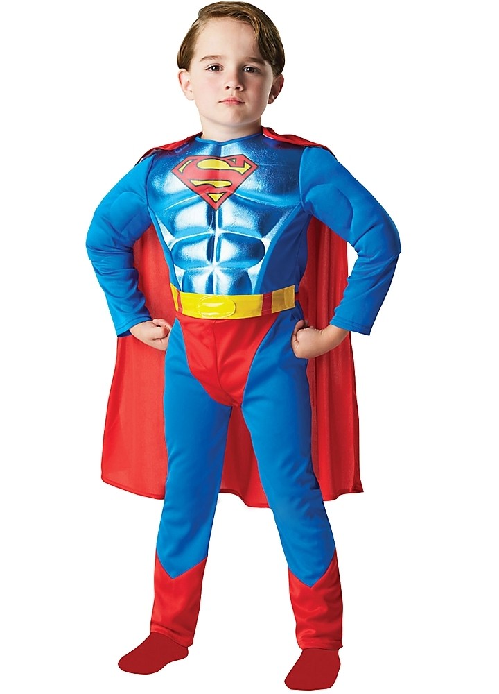Детский костюм Супермена с мышцами - яркий синий костюм супермена, который включает в себя комбинезон с накладными объемными мышцами с металлическим отливом. На груди имеется эмблема Супермена. Желтый пояс дополняет комбинезон. Также к нему прилагается красный плащ.
