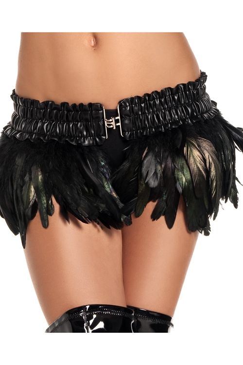 Черная перьевая юбочка - это экзотическая мини-юбочка на черном эластичном поясе. К поясу прикреплены черные перья, юбка застегивается при помощи крючка.
