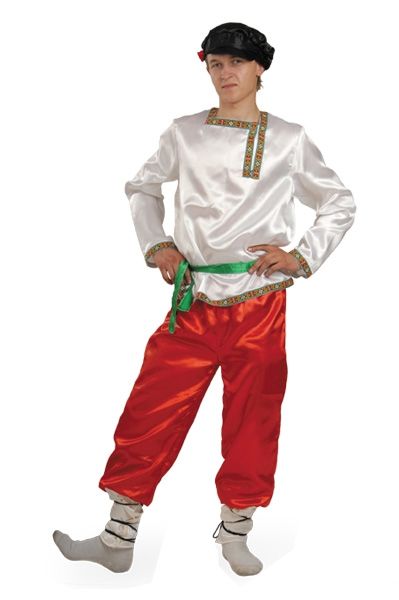 Костюм русского Ивана прекрасно подойдёт для постановки детских спектаклей, для маскарадов и подобных мероприятий. В комплект костюма входит белая рубаха с поясом, красные штаны и кепка. В этом костюме вы будете похожи на настоящего русского парня.