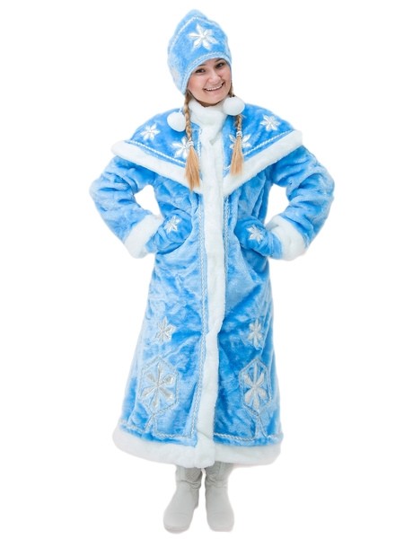 Костюм снегурочки Dlx - голубой костюм, выполненный из плюшевого материала. В комплект входит длинная шуба с белой меховой отделкой и узорами в виде снежинок из парчи. Также в комплект входит голубой кокошник с меховой отделкой и голубые варежки, украшенные снежинками.