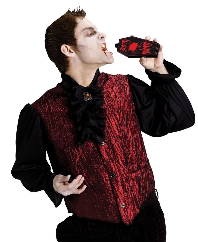 Набор Графа Дракулы включает в себя бордовый жилет с прикрепленными черными рукавами, жабо с рюшами и брошью в виде креста, а также черную фляжку в форме гроба. Для того чтобы завершить свой ужасный образ, вы можете подобрать грим, клыки и приобрести капсулы с кровью.