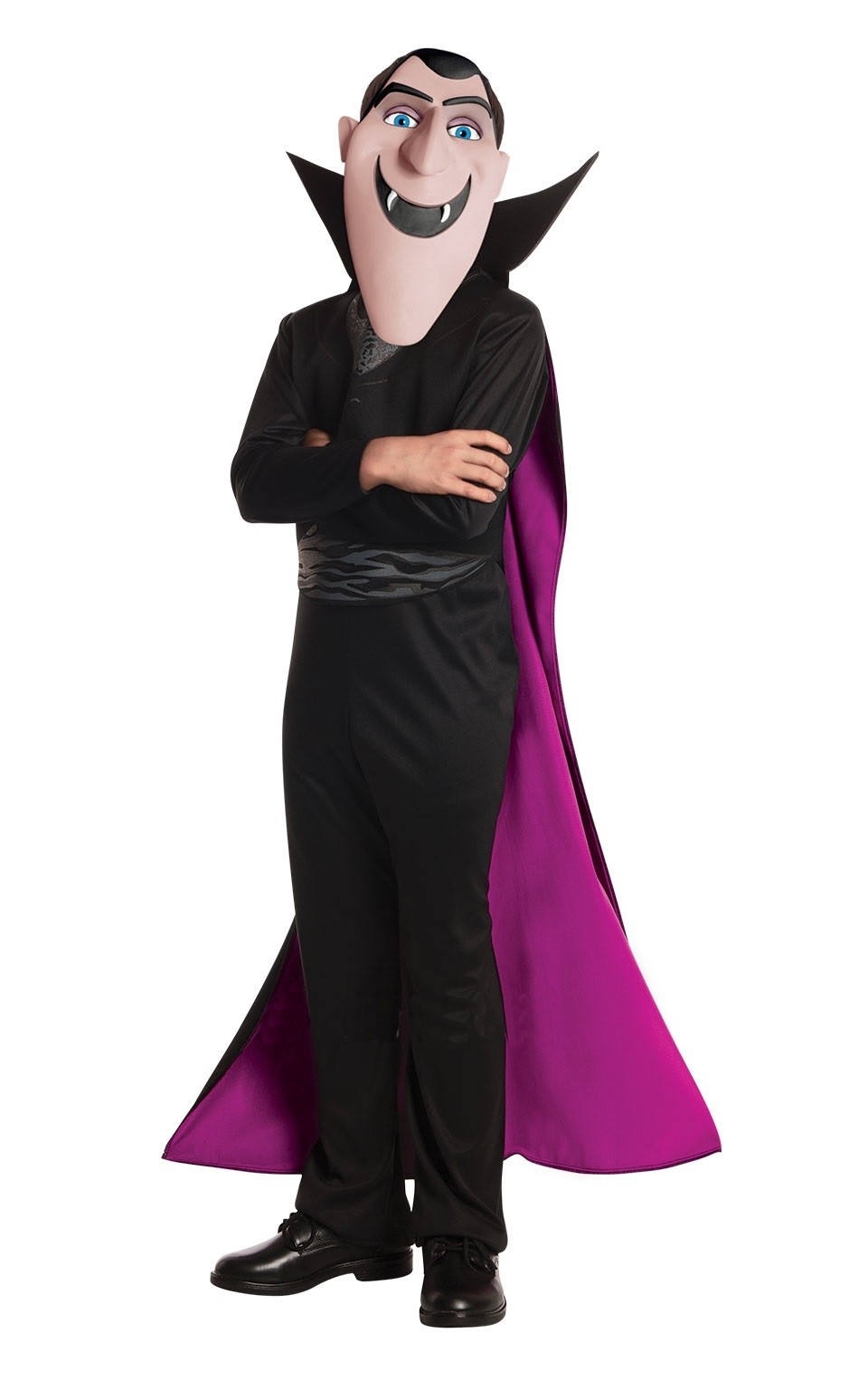 Костюм Дракулы из Отеля Трансильвания представляет собой образ вампира Дракулы из мультфильма "Отель Трансильвания 2". Костюм включает в себя черную манишку в виде передней части рубашки, плащ-накидку черно-фиолетового цвета с высоким воротником, черные брюки и маску с улыбающимся лицом Дракулы из мультфильма.