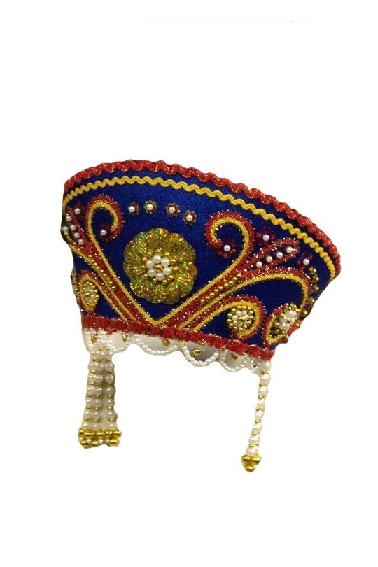 Синий круглый кокошник украшен узорами из тесьмы красного и желтого цвета, а также золотистыми и белыми бусинами. По середине кокошник украшает золотистый декоративный цветок. По бокам свисают цепочки из белых бусинок.