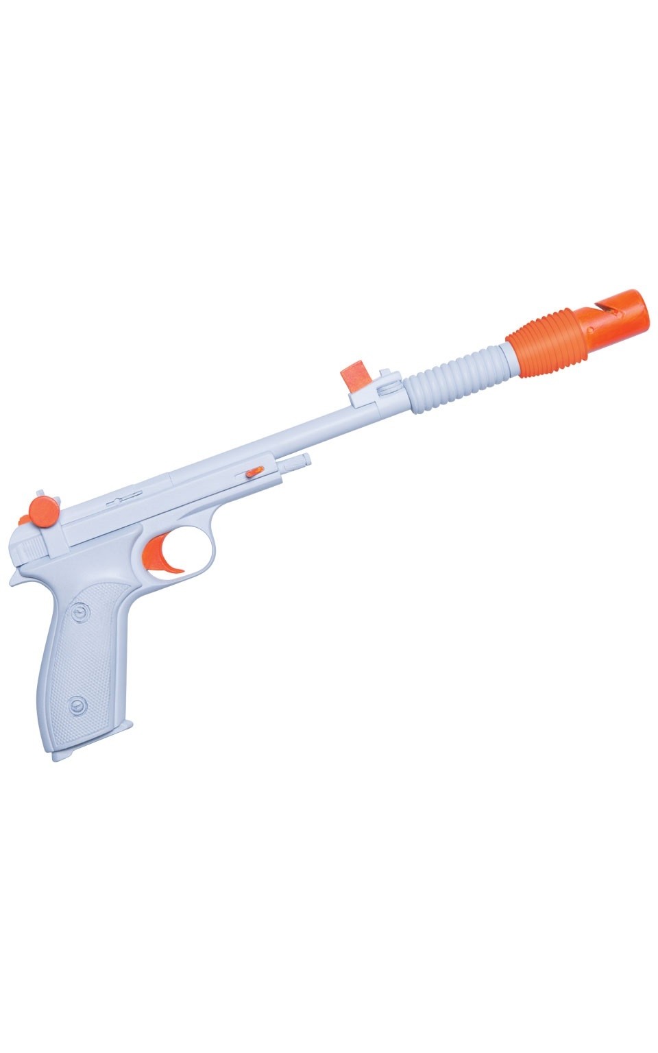Бластер выполнен в белом цвете с оранжевыми вставками.