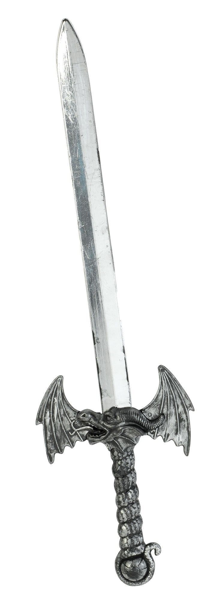 Меч рыцаря с серебряной рукояткой - это длинный меч, около 100 см, выполненный в серебряном цвете. На рукоятке меча имеется драконья голова с распахнутыми крыльями. Идеально для завершения образа бесстрашного рыцаря.