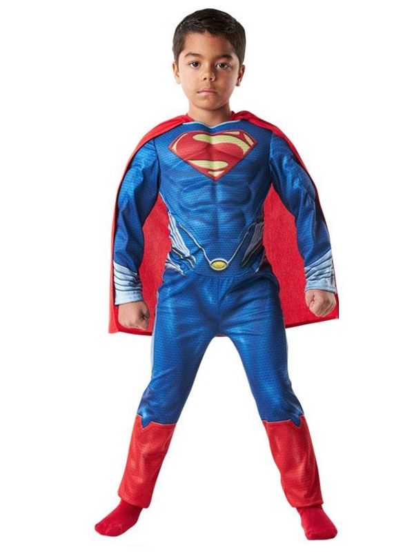 Детский костюм Супермена включает в себя синий комбинезон с эмблемой и накладными нагрудными мышцами, а также красный плащ.