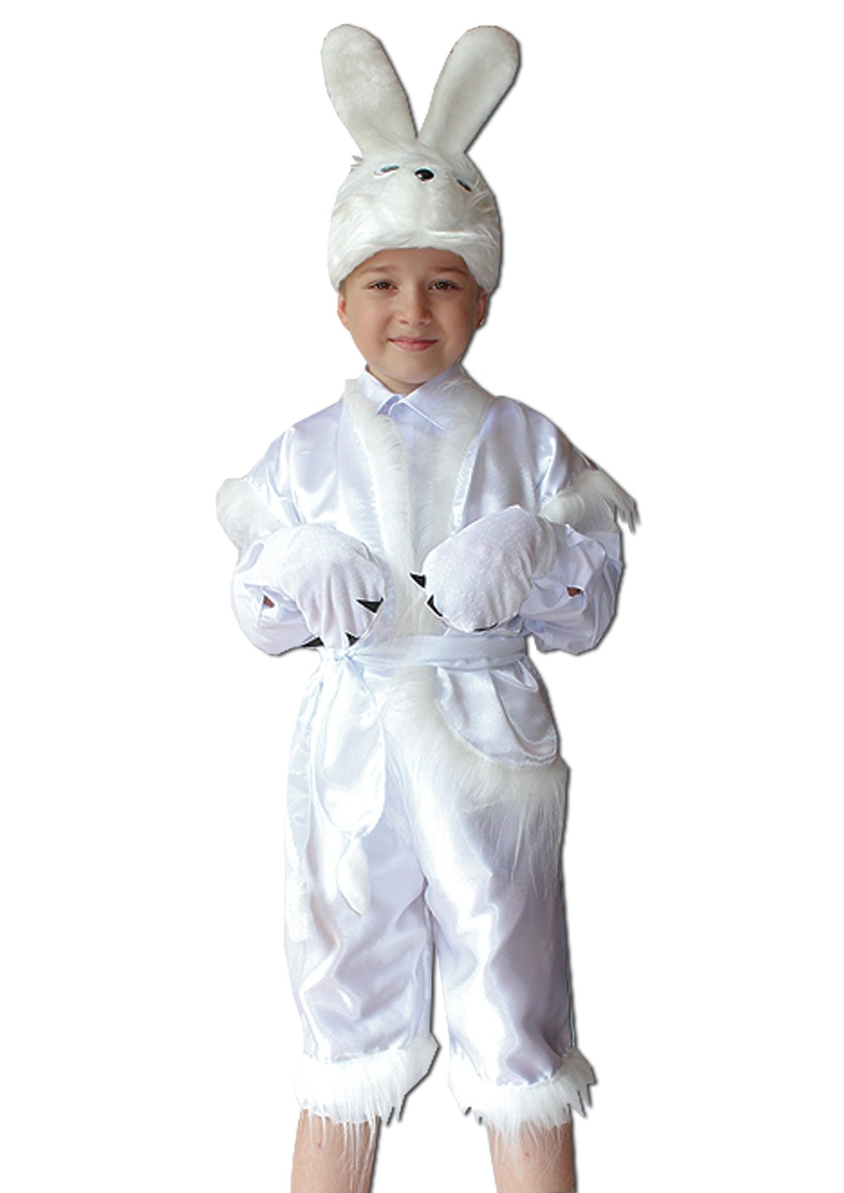Детский костюм пушистого зайчика - белый костюм из атласного материала с меховой искусственной отделкой. В комплект входит меховая шапочка в виде мордочки зайчика с ушками, жилет с меховой отделкой, бриджи чуть ниже колена с меховой отделкой, а также перчатки-лапки.