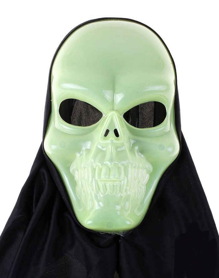 Светоотражающая маска улыбающегося черепа в черной накидке и огромными глазницами. Особый эффект вы произведете в темноте, когда будет излучать жуткий зеленый свет. Маска сделана из пластика, накидка из ткани. Размер маски 5х17х26 см.