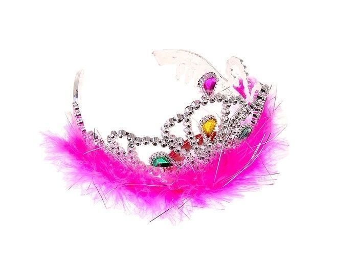 Корона с разноцветными камушками зеленого, желтого и розового цвета. Снизу корона декорирована розовым пухом. Корона сделана из пластика и имеет размер 12х8,5 см.